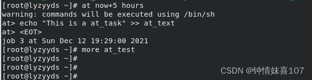 1.at配置在5小时后,将Thisisaattask写入root家目录中的at_test文件中等5小时后打开这个文件里面就有“Thisisaat_task”2.crontab配置...