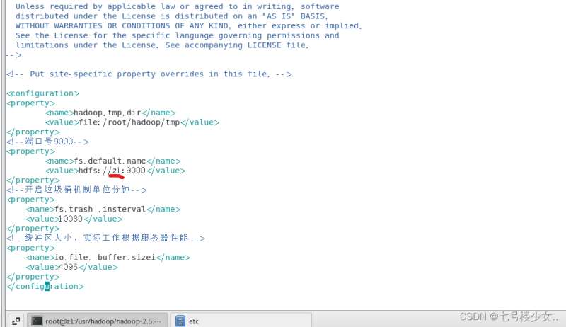 (2)进入 vim core-site.xml(z1:在主节点的ip或者映射名(改成自己的))