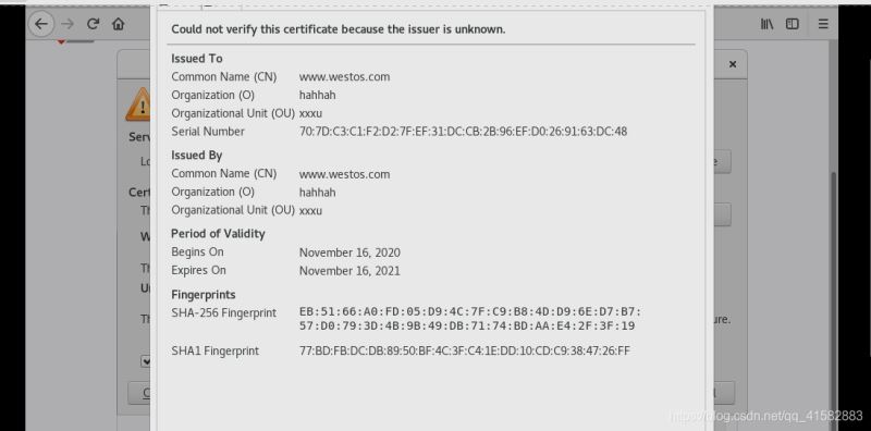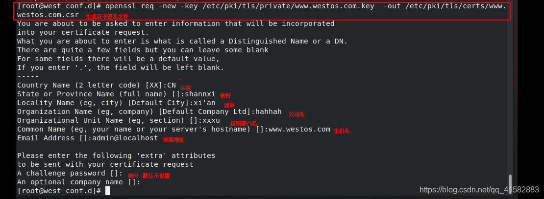 (3)生成证书签名文件:openssl req -new -key /etc/pki/tls/private/www.westos.com.key -out /etc/pki/tls/cert/www.westos.com.csr