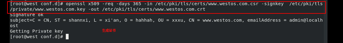openssl x509 -req -days 365 -in /etc/pki/tls/certs/www.westos.com.csr -signkey /etc/pki/tls/private/www.westos.com.key -out /etc/pki/tls/certs/www.westos.com.crt