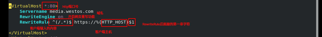 - 如果要使输入media.westos.com后跳转到https://media.westos.com,可以通过网页重写实现,也就是当访问http(80端口)时自动跳转到https(443端口)