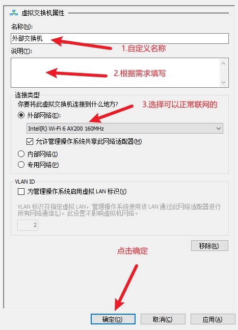 然后在这个界面名称具体规定,外部网络选择参考网络连接里面