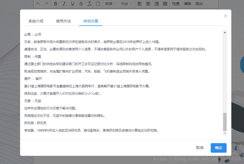当弹窗不设置高度时,界面会根据内容自动扩充高度,内容过长时会非常难看,需要设置固定高度,当超出这个高度后悔出现滚动条。效果如下图: