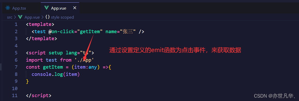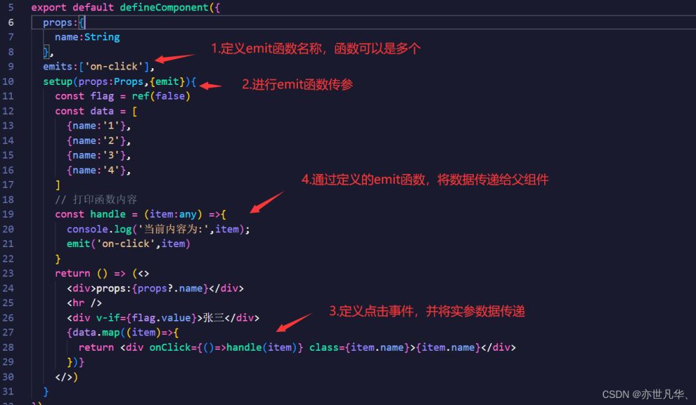 props与emit的使用: 使用tsx语法时也可以使用vue的props与emit语法,如下: