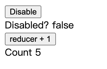 现在问题来了,当disabled props为true时(此时count为0),我们点击reducer + 1按钮5次,然后再点击Disable按钮(disabled props会变为false),此时count为多少呢?