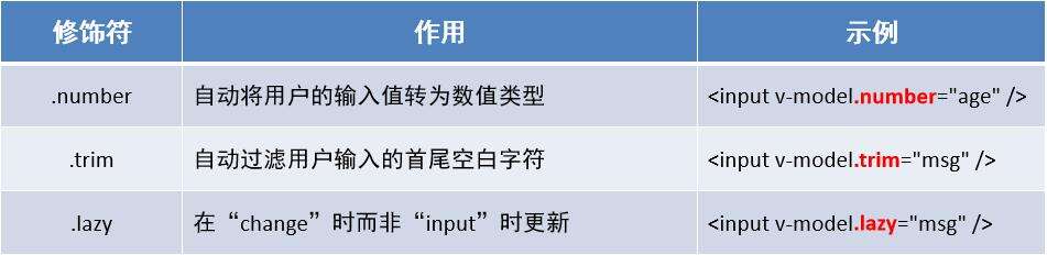 为了方便对用户输入的内容进行处理,vue 为 v-model 指令提供了 3 个修饰符,分别是