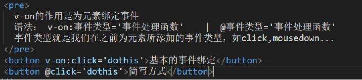为元素绑定事件。表达式可以是一个方法的名字或一个内联语句