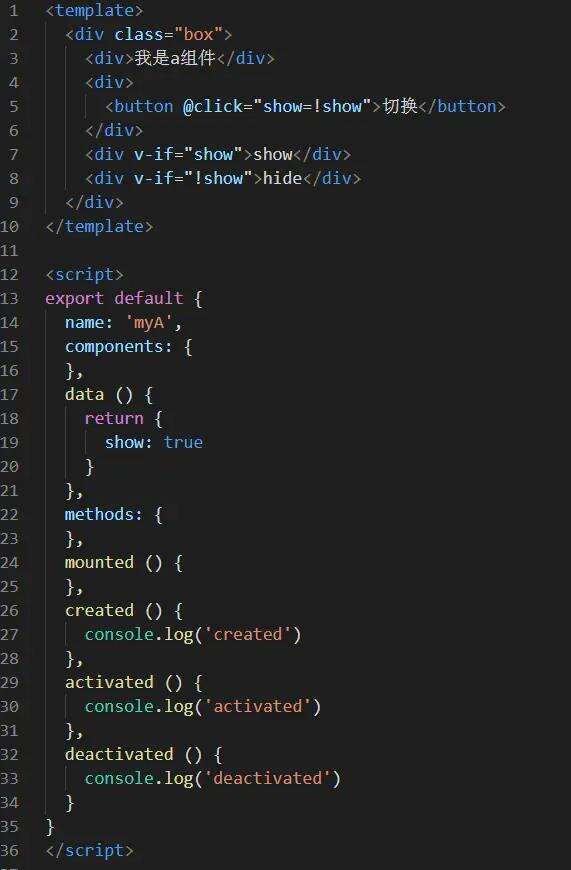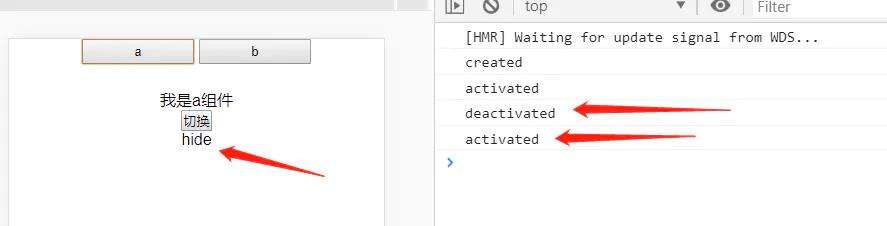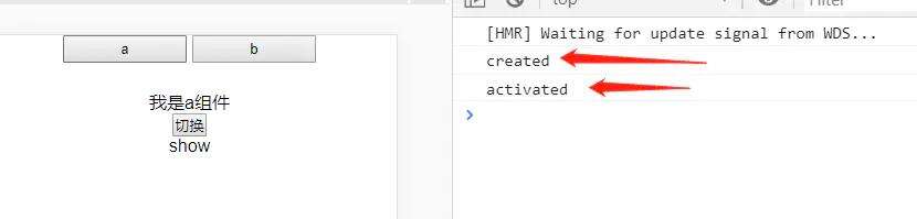 我们点击按钮a切换到a组件,可以看到created和activated执行了。然后我们把a组件的show切换成hide,在进行组件切换。