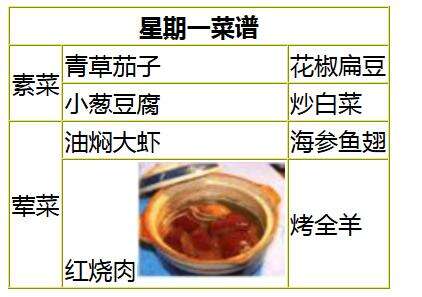 菜单:htmlheadmeta charset=utf-8title菜单练习/title/headbodytable border=1 cellspacing=0 bordercolor=#cc0trth colspan=3星期一菜谱/th/trtrtd rowspan=2素菜/td...