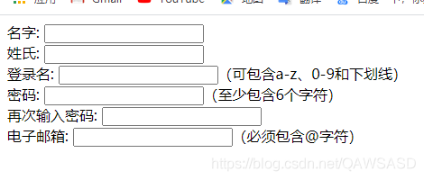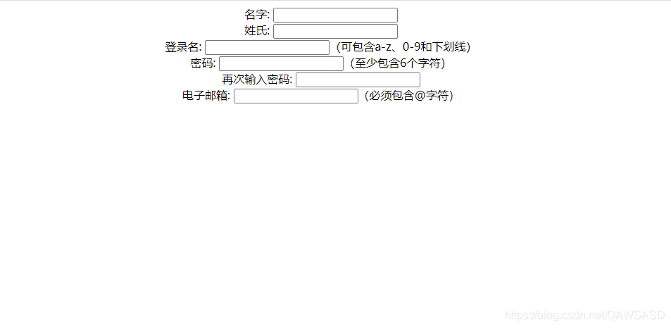 <input type="text" name="login name" required="required" pattern="^\w{4,8}$" id="login name" value="" />(可包含a-z、0-9和下划线)<br />