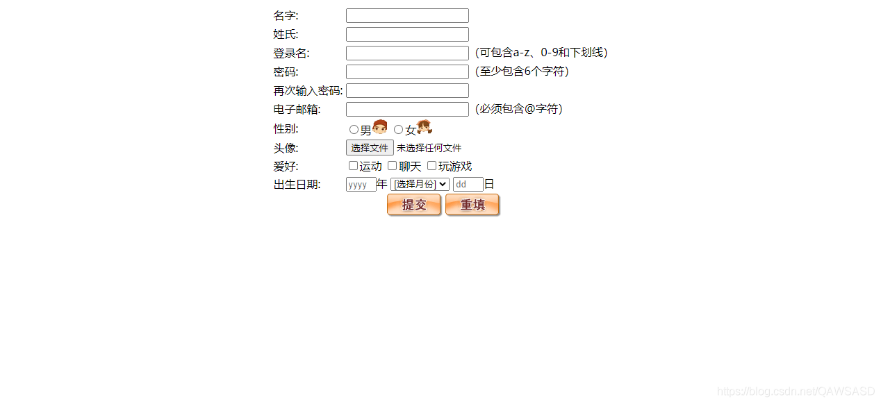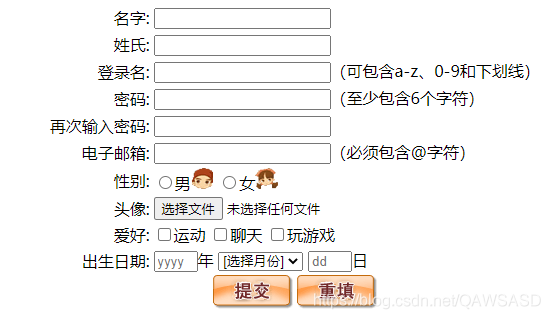 之前碰到一个作业,给了一张图片,让按照图片样式做一个表单,但在所有功能都实现后,发现无法让表单居中,一直缩在左上角,看起来很难看。在经过了各种修改后,终于成功将表单居中,下面分享一下我所经历过程中的错误与最终结果。(因为做这部分作业的时候还没有学 css,所以没用)