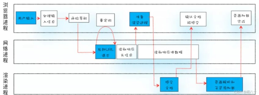 - 渲染进程准备好后,浏览器进程发出“提交文档的消息”,渲染进程接受了消息之后,会跟网络进程简历传输数据的管道。