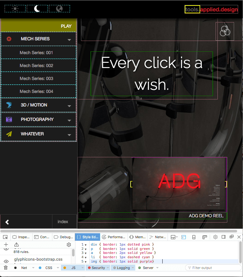 1 2 3 4 5 | div { border: 1px dotted pink } p { border: 1px solid green } a { border: 2px solid yellow } li { border: 1px dashed cyan } img { border: 1px solid purple} |