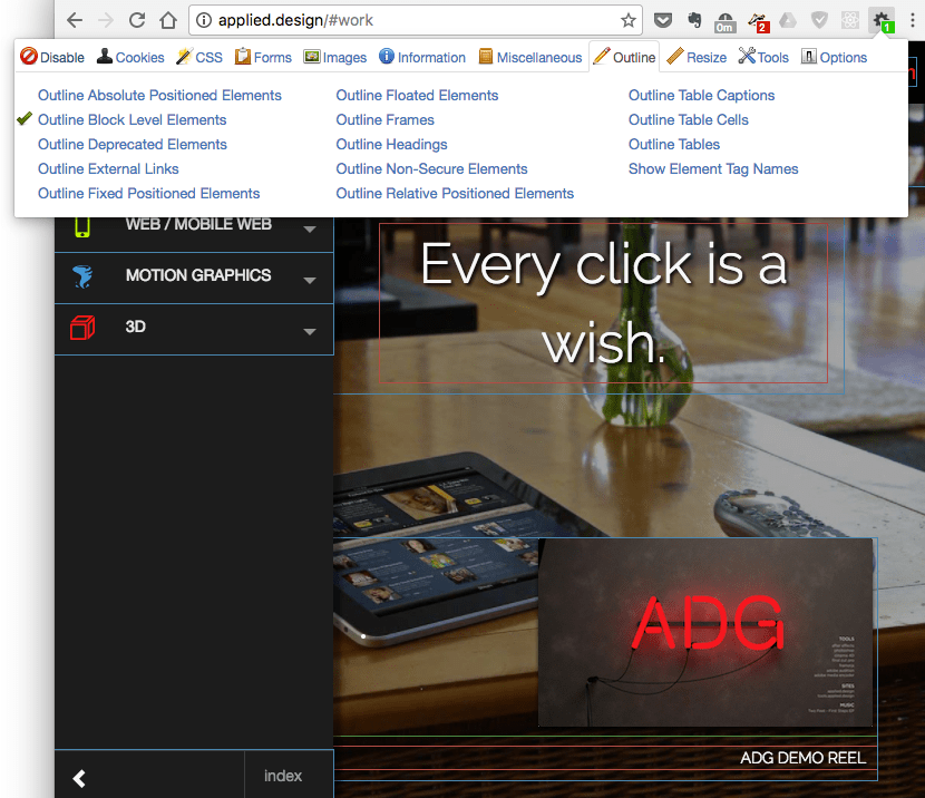 Outlines each element on the page to help you visualize their