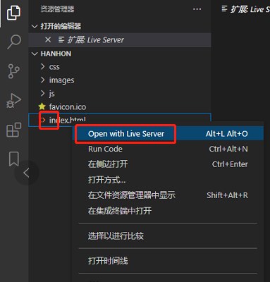 2、使用:安装好之后,就可以右击我们的html代码文件,选择open with live server