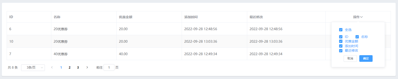 (2)点击表格最后一列表头(操作栏),弹出选择框;【el-popover】