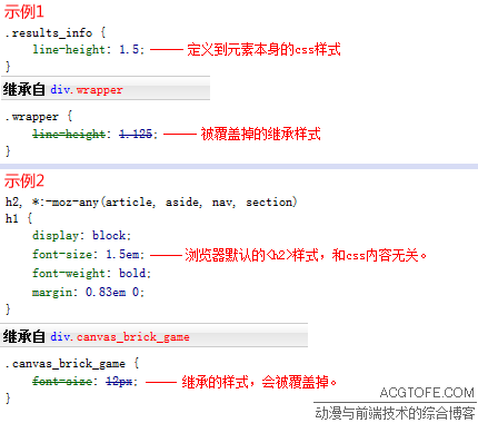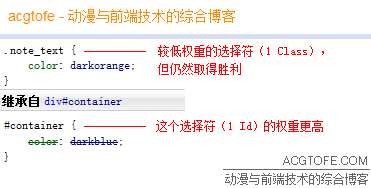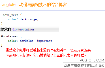 而且,继承样式是最低优先级这一点,是无视继承样式所在的样式规则的内容的。这就是说,继承样式所在的样式规则,即使其选择符的权重比元素本身样式的选择符的权重更高(本文后文会介绍选择符权重~ :) ),甚至继承样式被写了!important,继承样式会被元素本身样式覆盖这一点仍然成立。