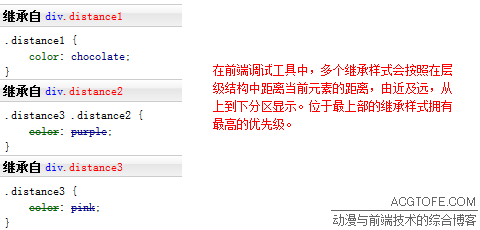 就近原则其实不算是新的结论,想一下,如果把每一个父级元素都作为当前元素,然后按照前边的“元素本身样式大于继承样式”的原则推理一遍,就可以明白,离得最近的父级元素的继承样式优先级最高,是很合理的。