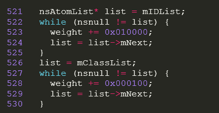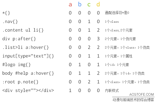 (a,b,c,d) 中,a代表的内联样式实际是存在于html代码中,只能取值为0或1,所以和其他的较为不同。后边的bcd虽说是不同的数量级,但详细说来有多大差距呢?请看下面这一段Firefox浏览器源代码: