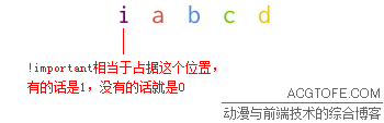 !important是可以写在样式规则中的某一属性定义值后的标识符,用于提升某一属性的样式定义的优先级。不同于决定整条样式规则优先级的css选择符权重,!important只影响自己所在位置的单一属性。!important在优先级原则中,可以理解为前文的(a,b,c,d)结构中的,比a更高位的标识: