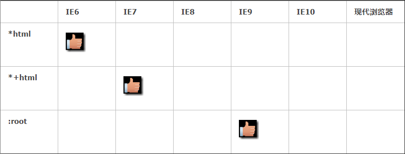 这样在属性值后面添加“!important”的写法只有IE6不能识别,其它版本IE及现代浏览器都可以识别,还有“+”、“\0”、”\9” 等,乱七八糟好烦,画个表