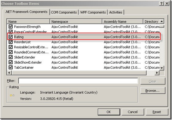 3. 注意,如果你在上述对话框中没有找到有关AjaxControlToolkit的控件,则需要自己指定AjaxControlToolkit.dll程序集的路径。读者如果没有找到该文件的话这里方便给大家提供一个下载。