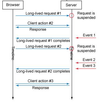 它的实现过程如下:页面加载的时候随即向服务器发送一条Ajax请求,服务器端获取请求并将它保存在一个线程安全的容器中(通常为队列)。同时服务器端仍然可以正常响应其他请求。当需要推送的事件到来的时候,服务器遍历容器中的请求在返回应答后删除。于是所有停留在页面中的浏览器都会获得该应答,并再次发送Ajax请求,重复上述过程。