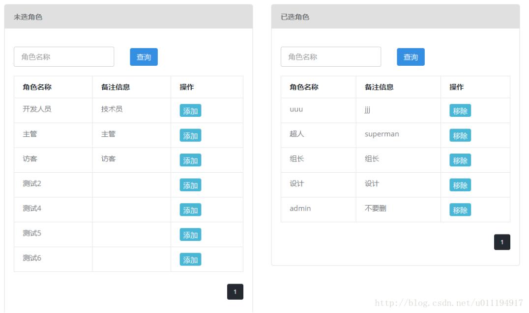 最近写一个给用户组添加角色的功能,要求一边是未添加的角色,一边是已添加的角色,还有搜索功能, 点击添加后,ajax保存操作.