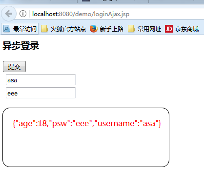 在浏览器中浏览该页面,并输入相关信息,然后提交,可以看到后台action直接将消息数据返回给页面,而同时页面也不需要进行刷新,而是直接在局部进行显示,这是利用了ajax的异步发送请求。注意,此种方式需要在struts.xml文件中要配置package继承json-default,且配置result类型为json,并在action中提供需要传递数据的对应的get方法。当然了前提是添加了struts2-json-plugin-2.3.16.3.jar,不然struts2是不会自动将数据转为json格式的数据的。