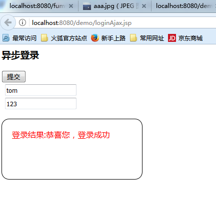 在浏览器中浏览该页面,并输入相关信息,然后提交,可以看到后台action直接将消息数据返回给页面,而同时页面也不需要进行刷新,而是直接在局部进行显示,这是利用了ajax的异步发送请求。注意,此种方式需要在struts.xml文件中要配置类型为stream的流,并设置inputName属性,并在action中提供InputStream对应的get方法。