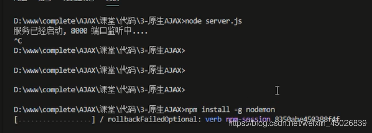 为了方便执行js脚本代码 避免老是重复开启窗口 我们这里 还需安装 nodemon 安装方式与express 一样 在终端输入:npm install -g nodemon