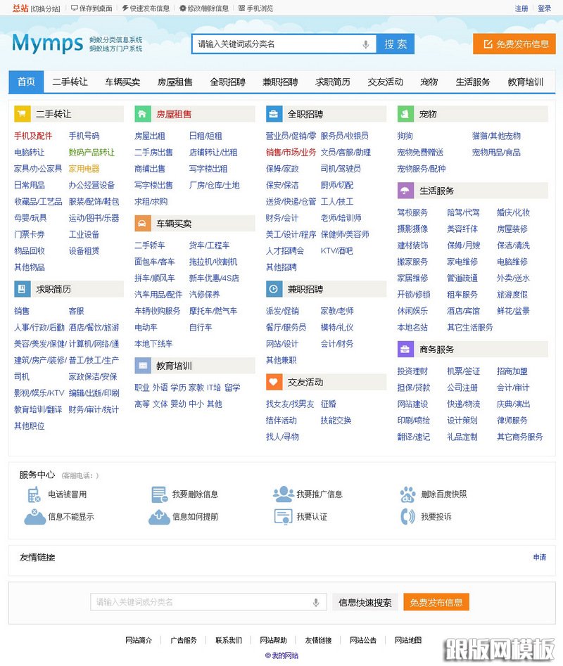 源码介绍 首页演示图片 列表页演示图片 内容页演示图片 其他页演示图片 蚂蚁分类信息5.7s多地区修复版,宽屏多色+手机版+UC整合+手机传图/签到/新闻/手机版,修复后台有管理的地方提示权限不足以及无法上传图片的错误,完美修复了很多错误和地方,不是外面能下载到的垃圾源码,有兴趣的朋友可以做一下,养一个分类信息站还是可以做一下域名权重的! 蚂蚁分类信息