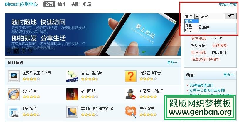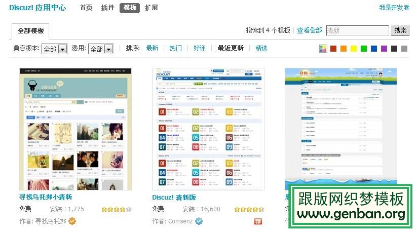 目前Discuz! 应用中心支持的应用类型有插件、模板与扩展。输入相应的关键词“清新”后共搜索到4个模板供站长选择。需要特别说明的是,Discuz! 清新版这块模板是官方出品并且很受欢迎,安装次数已经突破了16000次。
