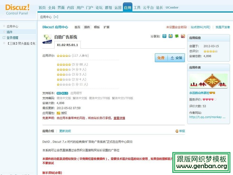 站长找到适合的应用后,下一步就是安装了。Discuz! 应用中心支持一键安装与卸载,傻瓜式操作大大降低了站长的技术门槛。进入任何一款应用的详情页即可点击安装应用。例如,进入一款“自助广告系统”插件,可以看到醒目的安装按钮以及相关属性。