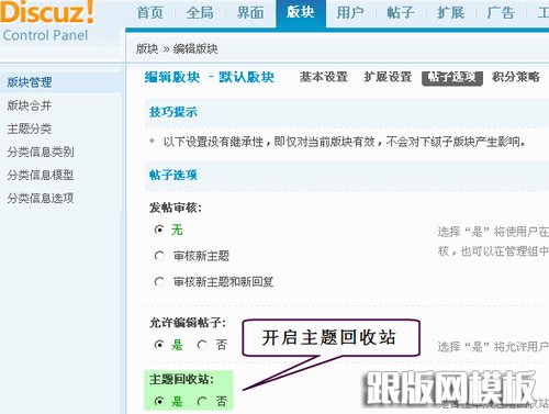 那这么好的功能怎样在 Discuz! 的后台开启呢?首先这个功能是跟每个版块关联的,所以每个版块都有此项设置,即可以控制哪些版块开启主题回收站的功能。在版块 => 版块管理 => 编辑要开启主题回收站的版块 => 帖子选项中,就可以设置这个版块开启或者关闭回收站。如下图所示:
