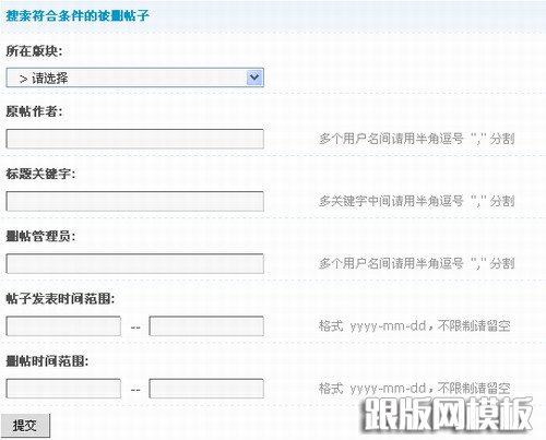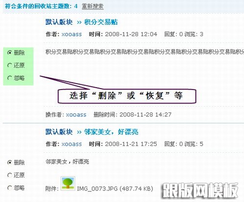 根据这些条件,可以搜索到主题回收站里的帖子,全部留空的话就是显示所有回收站内的帖子。如下图所示: