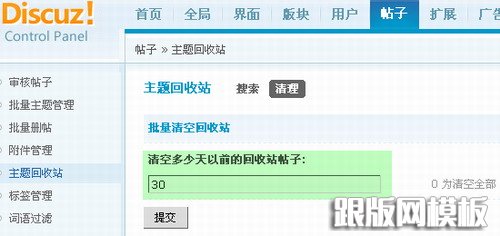 当回收站里面存在大量垃圾帖子的时候,还有个更快捷方便的操作可以批量清空回收站里的帖子,这个就是“批量清空回收站”功能。可以在后台 => 帖子 => 主题回收站 => 清理找到这个功能。只需要填写一个清空的时间,就可以方便快捷的清空多少天以前的回收站的帖子了,填0为清空全部的帖子。如下图所示: