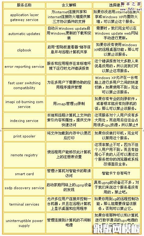 应该禁止哪些服务在众多服务中,大家可能有些茫然,我怎么知道哪些服务该保留哪些服务该禁止呢?呵呵,其实不难,每个服务都有简单的描述,通过描述你可以大概判断出是否需要该服务。附表是一些可以关闭或者禁用的服务,你可以有选择地关闭。