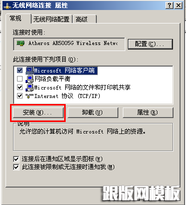 第3步:在打开的网络连接属性中的“常规”选项卡中,单击“安装”按扭。如下图所示。