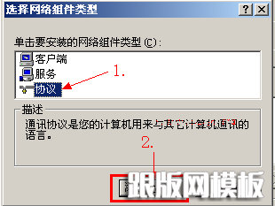 第4步:在选择网络组件类型中,单击选中"协议"类型,再单击左键“添加”按扭。