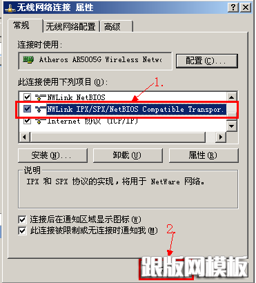 第5步:在网络连接中单击选中“NWLink IPX/SPX/NetBIOS Compatible Transport Protocol”,再单击确定按扭。
