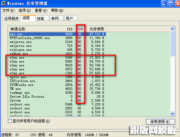 观察进程为 w3wp.exe 的,查看那个CPU 占用的高,再利用其 PID 于 iisapp 中列出的结果对比,就能轻松的找出是那个站点占用的CPU过高了