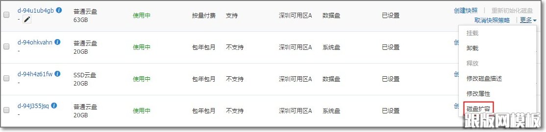 首先进入磁盘列表页面,点击更多,选择扩容,如下图: