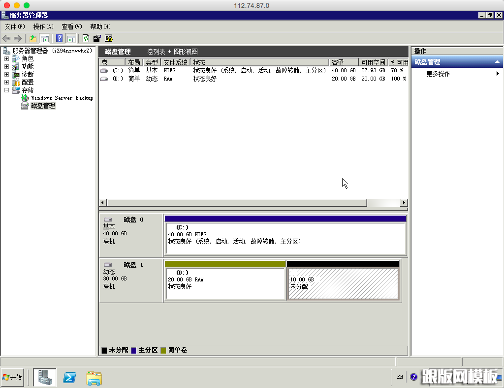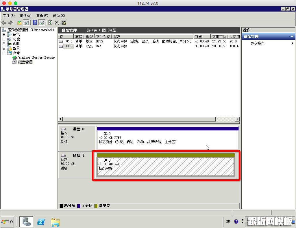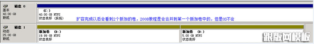 注意:完成后新购买的空间就自动增加到 D 盘中了,但是在磁盘管理器里面显示的是有多个卷存在的,这里跟 Windows 2008 扩容过程有所不同。 Windows 2003 中,扩容多少次就会有创建多少个独立的卷,不会将所有的卷都合并到之前的卷里面,但并不会影响实际使用。
