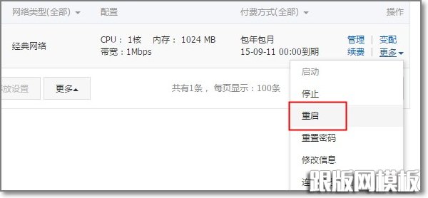 重启服务器。进入实例列表页面,点击 更多,选择 重启。