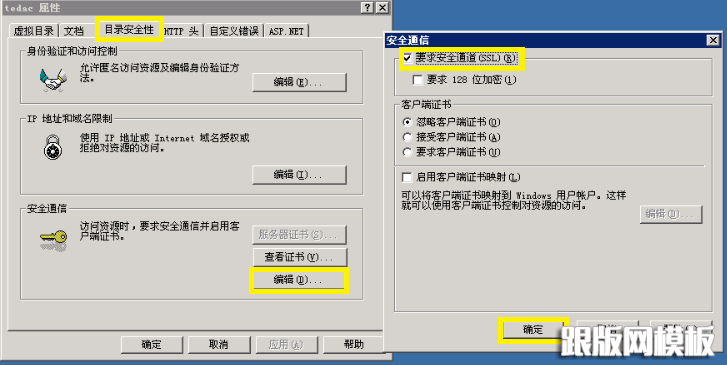 2、选择“目录安全性”-->在安全通信中选择“编辑”