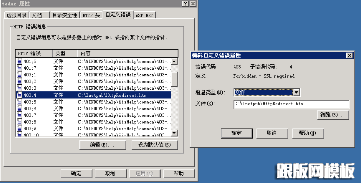 3、在“文件”中添加HttpRedirect.htm文件(路径为:C:\Inetpub\HttpRedirect.htm)