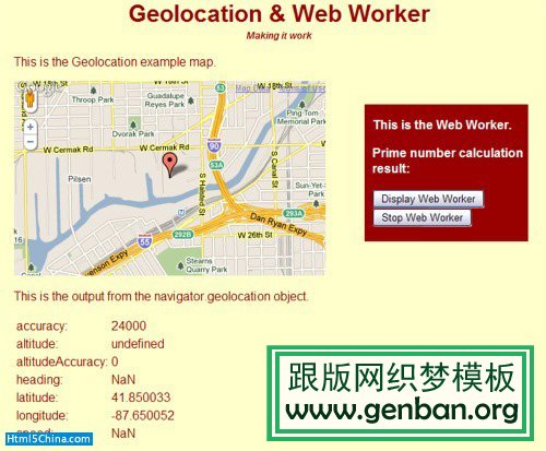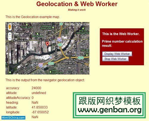 在执行时,网页的显示如图2所示。如果要查看地理位置数据的话,你首先必须要同意共享你的信息。web worker在页面加载时启动,如果你想看一看找到的素数的话,点击Display Web Worker按钮。