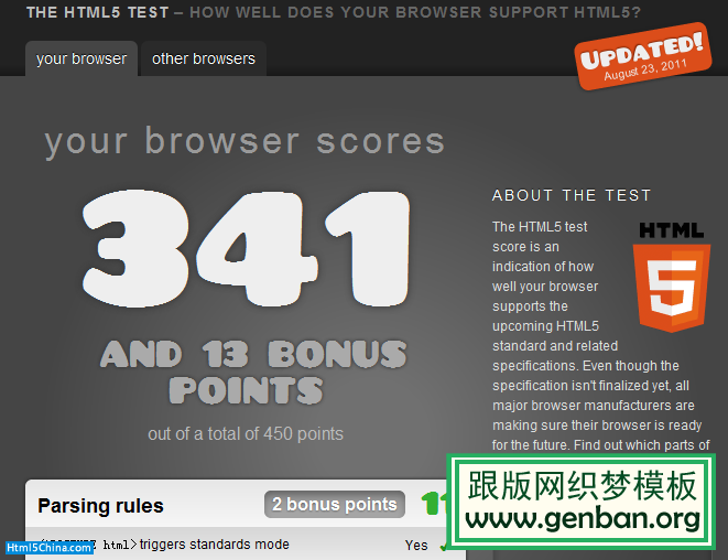 测试某一浏览器对HTML5的支持程度很简单,用该浏览器访问 http://www.html5test.com 就可以得出结果。
