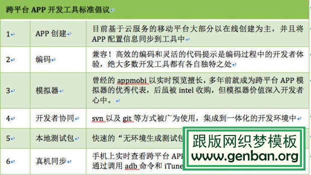 作为一款标准化的跨平台 App 开发工具需要具备哪些重要功能?纵观国内外移动云服务以及移动平台服务商的开发工具功能清单,归纳如下: